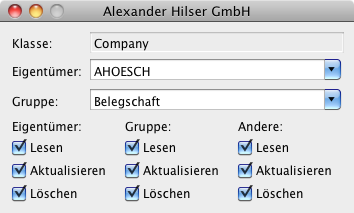 mit dessen Hilfe Zugrifffsberechtigungen für dieses Objekt vergeben werden können. In diesem Beispiel ist aus dem Inspektor ersichtlich, dass der Benutzer AHOESCH das Objekt erstellt hat und in der Gruppe Belegschaft verwaltet wird. Alle in der Gruppe Belegschaft und auch alle sonstigen Datenbank-Benutzer dürfen schreibend und sogar löschend auf das Objekt zugreifen. Zum Ändern dieser Rechte können einfach die Haken entsprechend gesetzt oder entfernt werden.