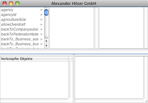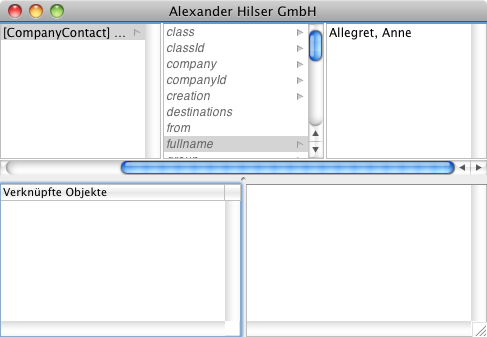 Über die Browser-View in diesem Fenster kann sich der Benutzer durch den Objekt-Baum hangeln, z.B. von der Firma über die Relation companyContancts hin zu einer Person und deren Namen.