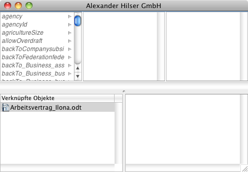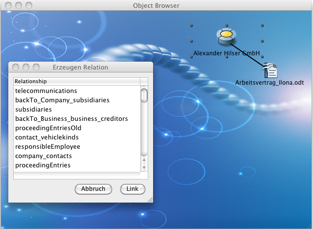 Im unteren Bereich dieses Fensters werden Verknüpfungen angezeigt. Jedes Business-Objekt in der Datenbank kann mit jedem anderen Business-Objekt verknüpft werden, entweder über eine im Datenmodell vordefinierte Relation - z.B. Customer::invoices - oder aber arbiträr. Wenn wir z.B. ein odt-Dokument in OpenOffice erstellt und dieses in der Datenbank abgelegt haben (integriertes Documenten Management) können wir via Ctrl-Shift-Drag auf dem Object Browser Fenster eine Verbindung zwischen der Firma und diesem Dokument herstellen.